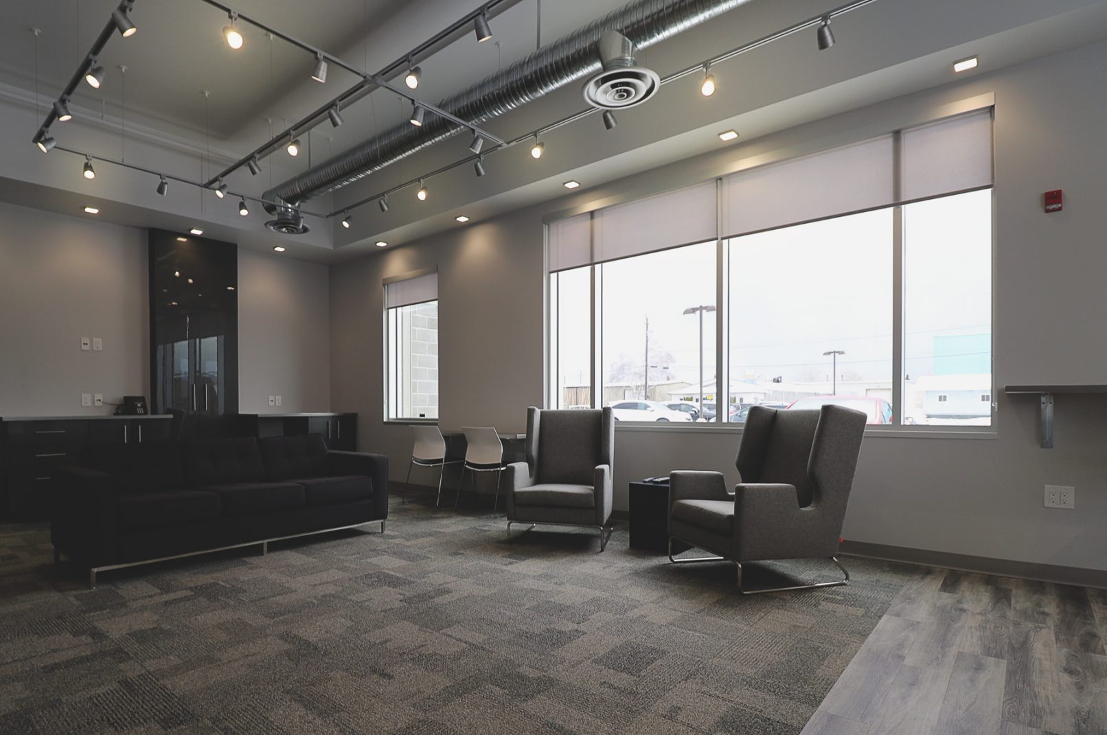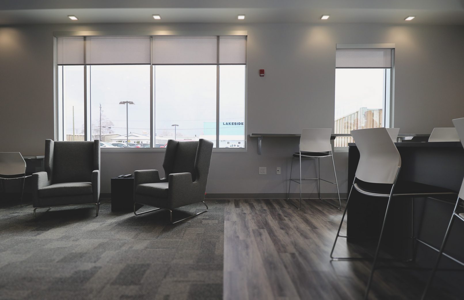 By using large, open common work areas with low-height workcentres and incorporating glass into many sides of the enclosed office spaces, we were able to keep natural light flowing through the space. The break room is home to a large kitchen with bar seating and the exposed and neatly fabricated HVAC lends a modern-industrial feel to the space.
